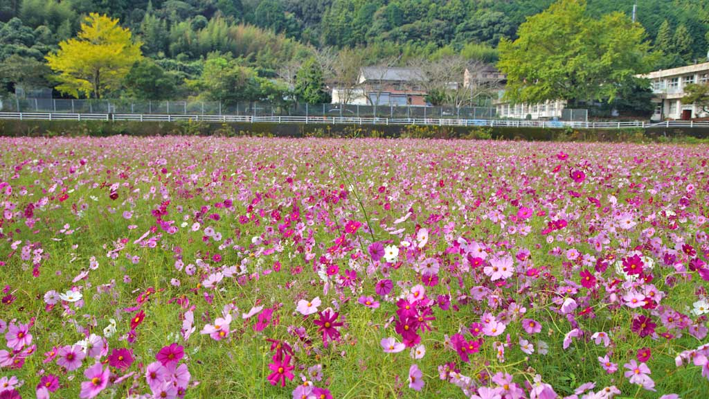 2025.10.23 姫ノ井地区のコスモス畑(約1ヘクタール)が満開になりました。場所は、国道321号線沿い、旧姫ノ井小学校の前の畑です。 こちらのコスモス畑は、今年から姫ノ井地区のみなさんが育てているもので、国道沿いの稲刈りが終わった約1ヘクタールの水田跡に種を蒔いており、現在、ちょうど見頃になっています。 これに合わせて、姫ノ井地区では今週末の10月26日(日)10時より『コスモス祭り』を開催します。売店のほか、13時からは餅投げも行いますので、皆様、お誘いあわせのうえ、ご来場ください。