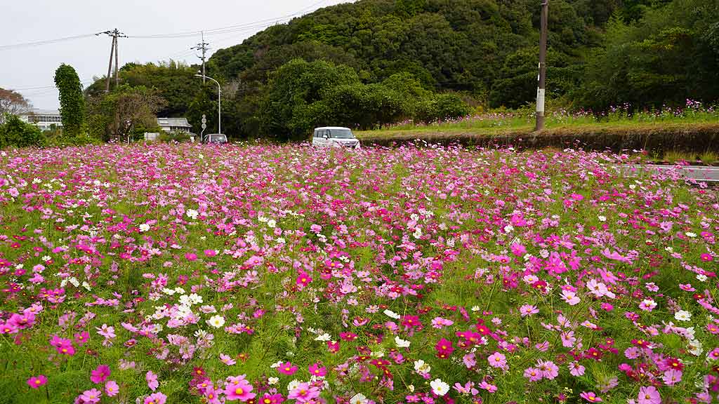 2025.11.04 弘見地区(道の駅・大月周辺)のコスモス畑(画像)が満開になりました。見頃は今週末まで。この畑が一番最後になります。 今週末の9日(日)には、弘見神社の秋祭りが開催されます。また、来週末の15日(土)には、『秋の灯寄祭り』(場所:町立中央公民館駐車場)が開催され、町内から24軒出店のマルシェや竹灯籠の点灯、米や野菜の詰め放題などのイベントが開催されます。16日(日)には『アサギマダラ観察会』、30日(日)には『牧野富太郎の道を歩くin大月町』が開催されます。今月もイベントがいっぱいの大月町に、皆様お誘いあわせのうえお越しください。